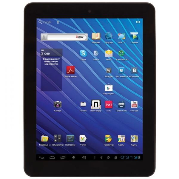 ОС: Android 4.0. Процессор: MTK8377 ARM Cortex-A9, двухъядерный, 1 ГГц. Память: 1 Гб ОЗУ, 4 Гб ПЗУ. Карты памяти: microSD (максимальный объем 32 Гб). Вес: 420 г. Размер: 200*153*10 мм. Батарея: 4000 mA. Экран: TFT. Размер, д.: 8. Камера: 2 МП , Wi-Fi, Bluetooth, 3G, GPS.